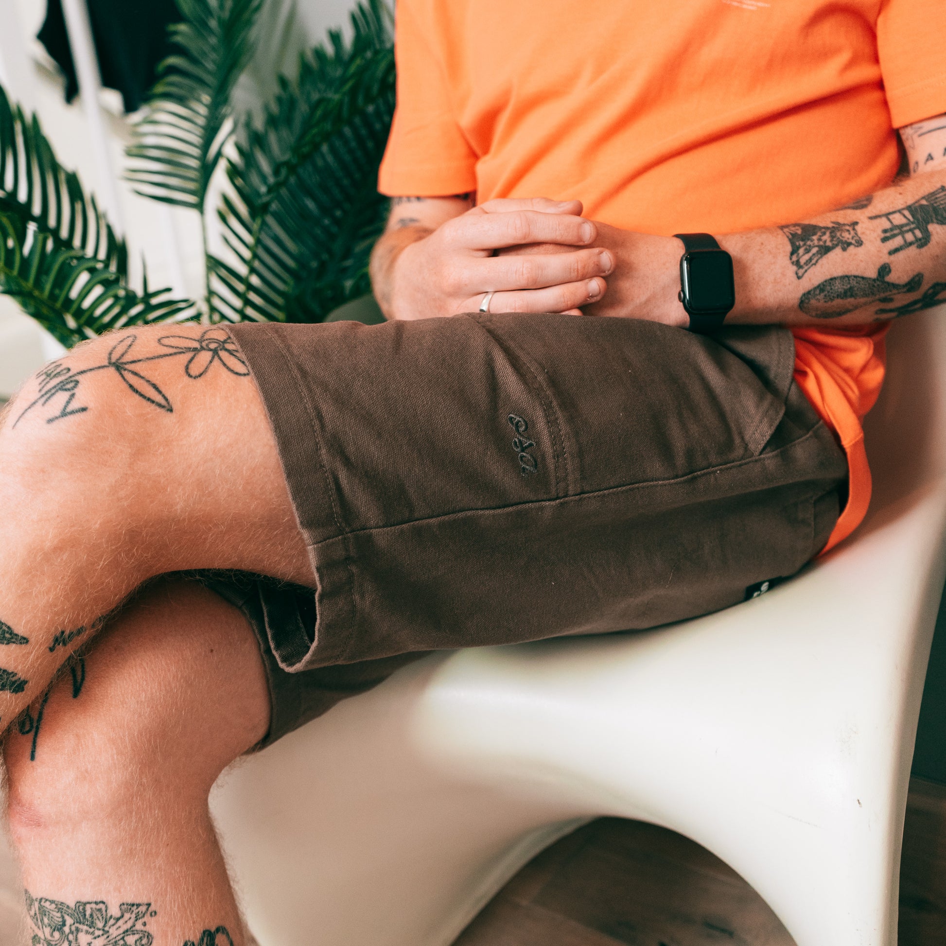 Brown Summer Essentials Carpenter Shorts. Fitting at the knee, these can be dressed up or down meaning they are a staple for your summer wardrobe. Featuring stitch panel branding on the back pocket, and a subtle stitched embroidery on the front, with multiple pockets to store your things. Brown is the perfect colour to add different tones to your outfits, we recommend matching these up with a simple grey or white t-shirt to make a great minimal summer 'fit.